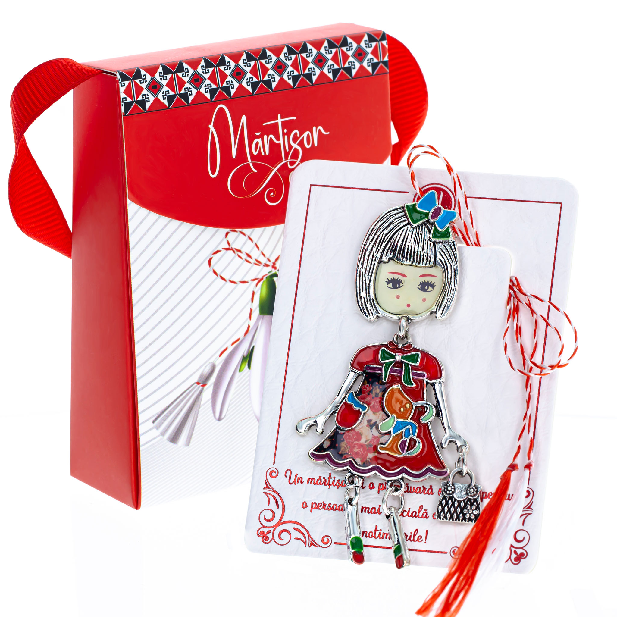 - Broșă Mărțișor Gentuță Fetiță cu Fundiță Verde, șnur Marțișor alb-roșu, ambalată în cutie tip gentuță, pregătită cu grijă pentru a fi oferită drept simbol al tradiției și al frumuseții primăverii.
