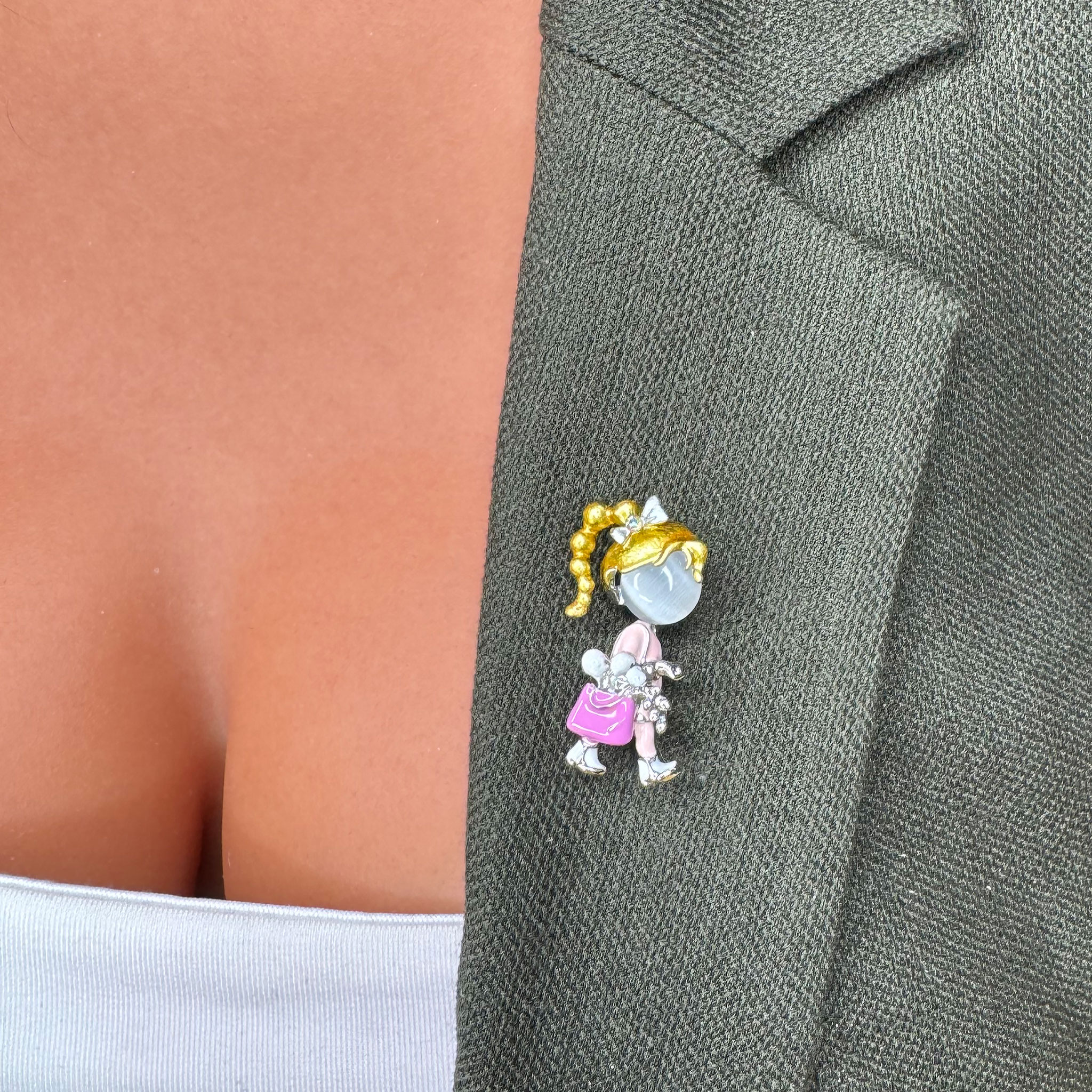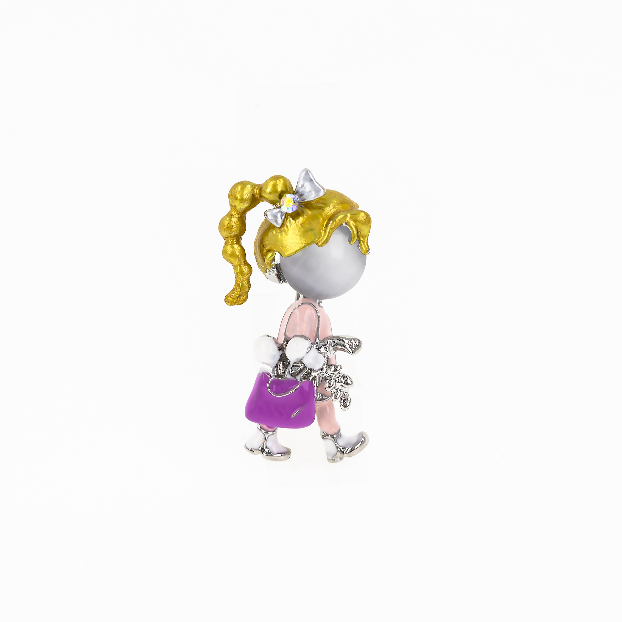 - Design: Broșa este realizată sub forma unei fetițe stilizate care ține o gentuță roz, cu detalii fine și expresive, creând un accesoriu simpatic și atractiv.