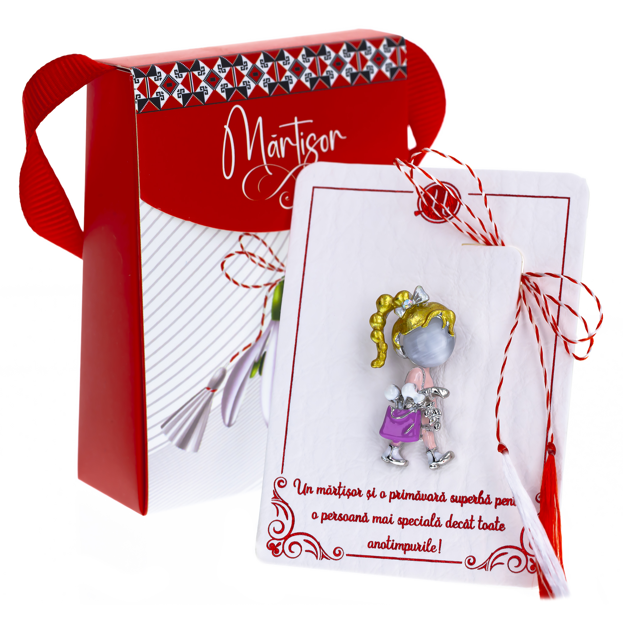 - Broșă Mărțișor Gentuță Fetiță cu Gentuță Roz, șnur Marțișor alb-roșu, ambalată în cutie tip gentuță, pregătită cu grijă pentru a fi oferită drept simbol al tradiției și al frumuseții primăverii.