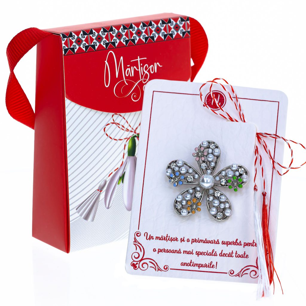 - Broșă Mărțișor Gentuță Floare Argintie cu Perluțe, șnur Marțișor alb-roșu, ambalată în cutie tip gentuță, pregătită cu grijă pentru a fi oferită ca un cadou special, simbol al tradiției.