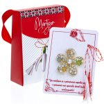 - Broșă Mărțișor Gentuță Floare Aurie cu Perluțe, șnur Marțișor alb-roșu, ambalată în cutie tip gentuță, pregătită cu grijă pentru a fi oferită ca un cadou special, simbol al tradiției.
