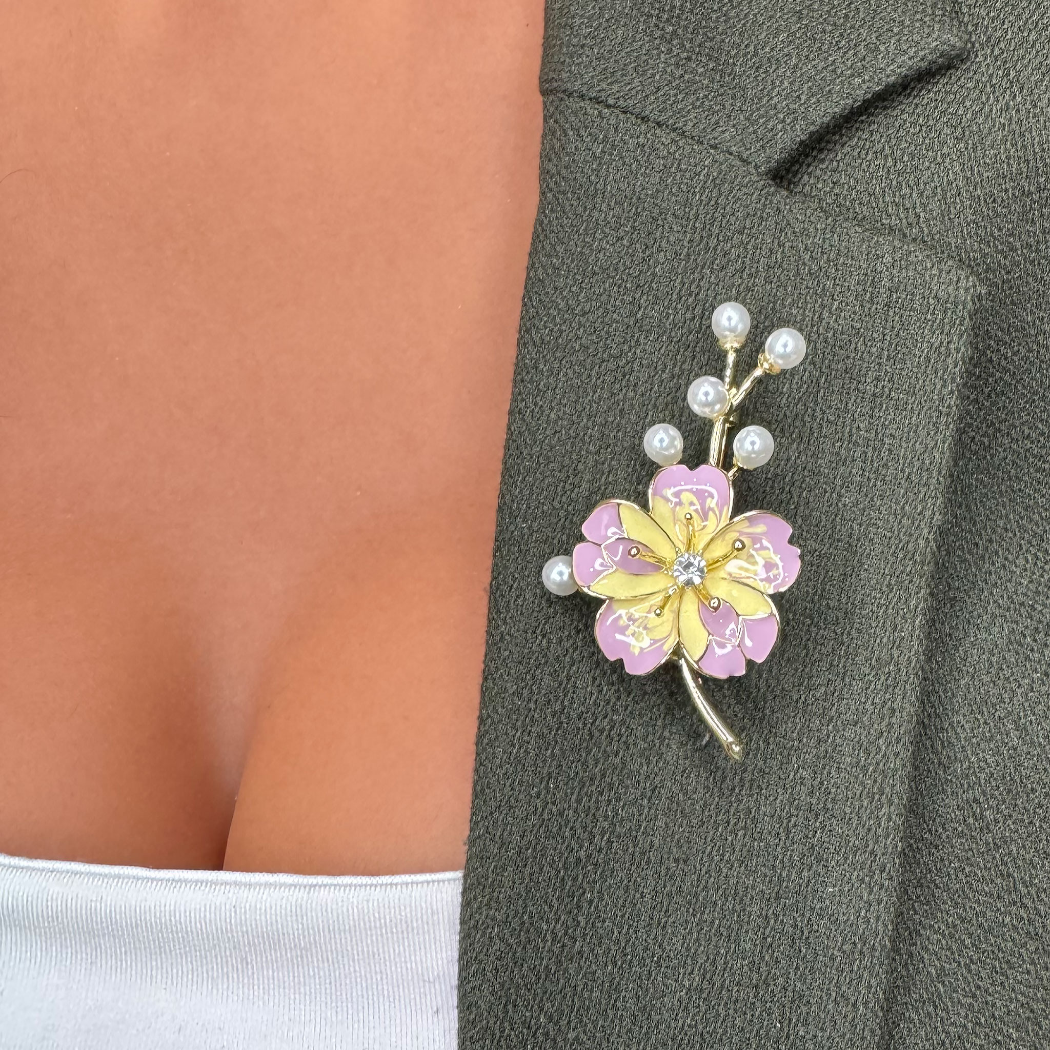 Această broșă în formă de floare cu petale mov este o bijuterie feminină și elegantă, potrivită pentru a adăuga o notă subtilă de rafinament oricărei ținute. Este perfectă pentru a fi purtată la evenimente speciale sau pentru a oferi un accent subtil și fermecător unei ținute de zi cu zi.