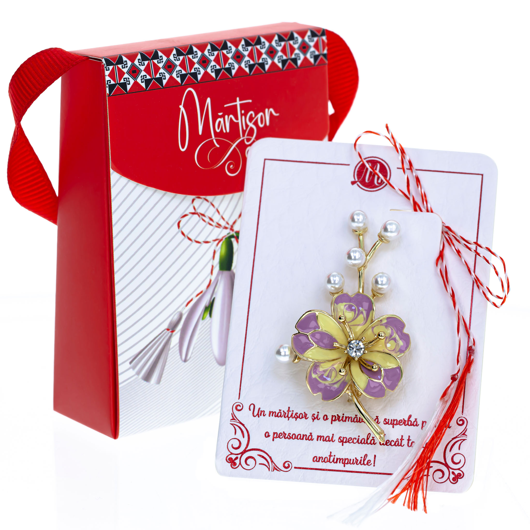 - Broșă Mărțișor Gentuță Floare Aurie cu Petale Mov, șnur Marțișor alb-roșu, ambalată în cutie tip gentuță, pregătită cu grijă pentru a fi oferită ca un cadou special, simbol al tradiției.