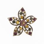 Această broșă în formă de floare aurie decorată cu pietre, evocă eleganța naturii și grația detaliilor minuțioase. Pietrele sclipitoare accentuează frumusețea și subtilitatea florii, transformând broșa într-un accesoriu deosebit pentru orice ținută.