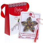 - Broșă Mărțișor Gentuță Floare Aurie Delicată cu Pietre, șnur Marțișor alb-roșu, ambalată în cutie tip gentuță, pregătită cu grijă pentru a fi oferită drept simbol al tradiției și al frumuseții primăverii.