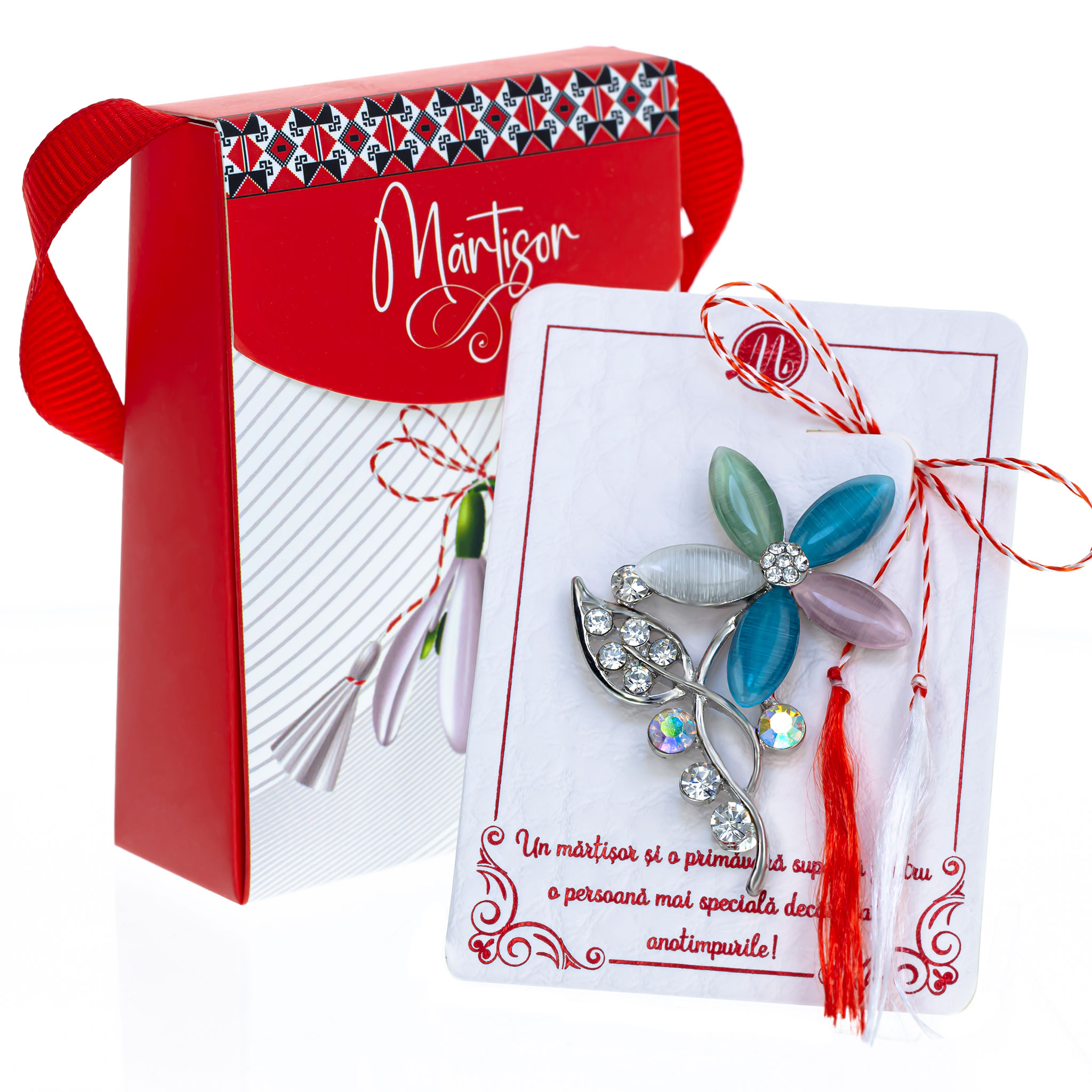 - Broșă Mărțișor Gentuță Floare Colorată, șnur Marțișor alb-roșu, ambalată în cutie tip gentuță, pregătită cu grijă pentru a fi oferită ca un cadou special, simbol al tradiției.