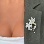 Această broșă emană o aură de rafinament și eleganță, potrivită pentru a evidenția frumusețea și feminitatea într-un mod subtil și rafinat. Cu designul său în formă de floare cu frunzulițe și strălucirea pietrelor, transmite un aer sofisticat și clasic, fiind potrivită pentru ocazii speciale sau pentru a sublinia eleganța unei ținute.