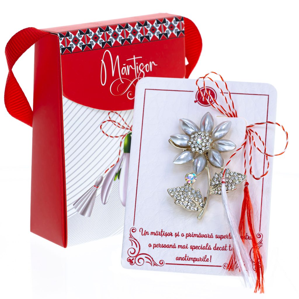- Broșă Mărțișor Gentuță Floare cu Petale din Perluțe, șnur Marțișor alb-roșu, ambalată în cutie tip gentuță, pregătită cu grijă pentru a fi oferită ca un cadou special, simbol al tradiției.
