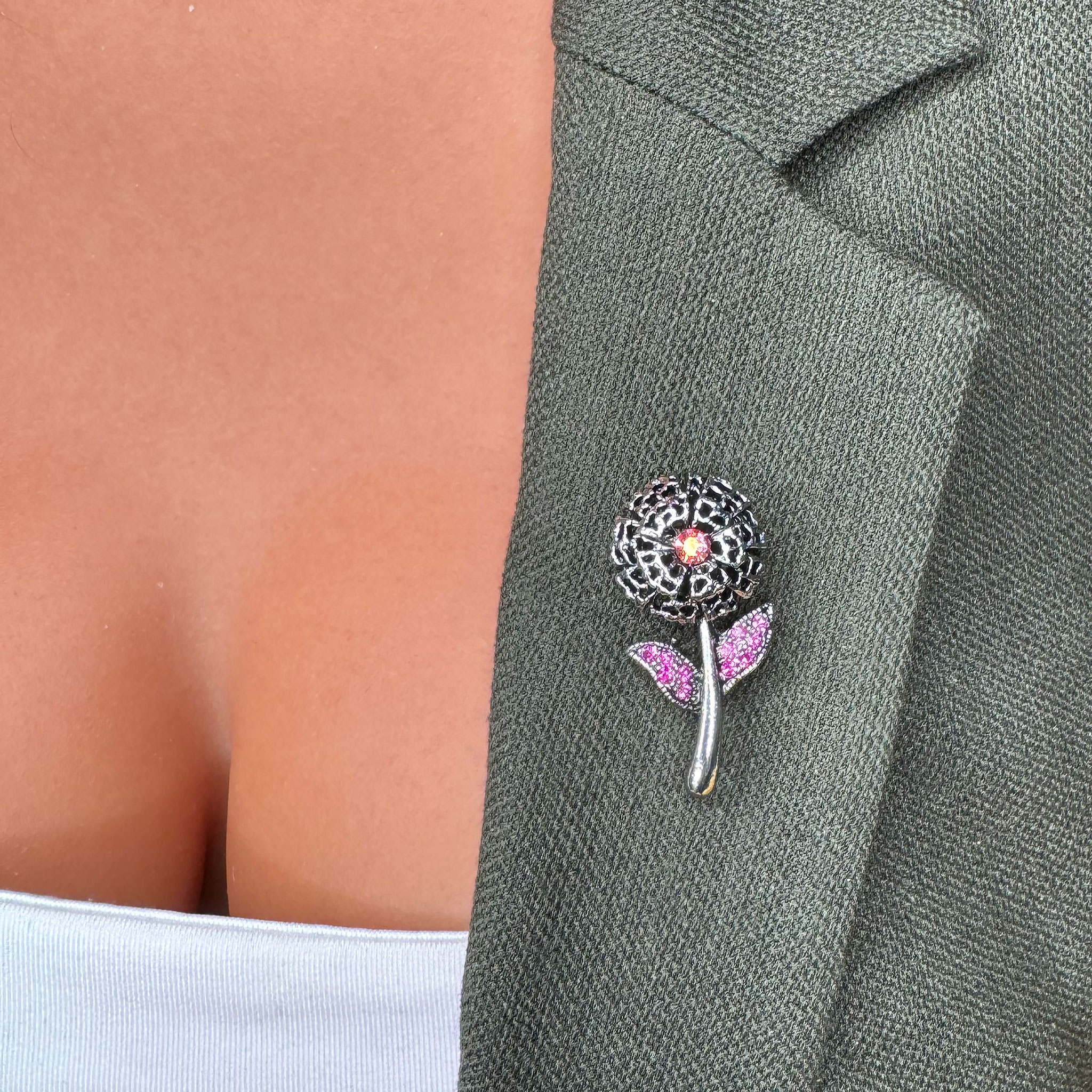 - Design: Sub forma unei flori stilizate, broșa este împodobită cu pietre fucsia strălucitoare, care creează un efect vizual intens.