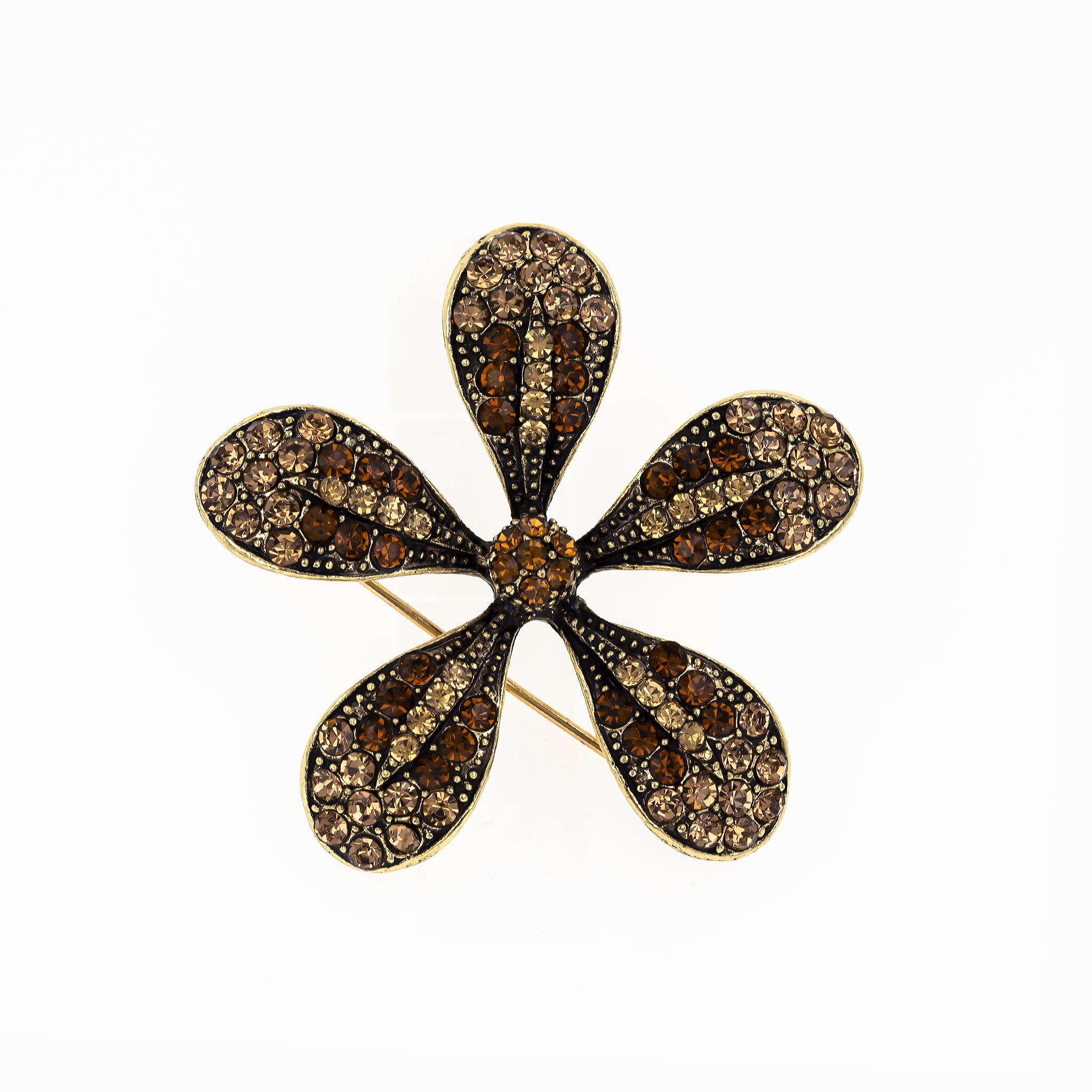 - Design: Realizată sub forma unei flori stilizate, cu finisaj auriu, broșa emană eleganță și gingășie. Conturul fin și detaliile atent lucrate îi conferă un aspect sofisticat și clasic.