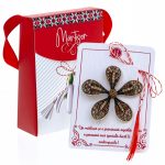 - Broșă Mărțișor Gentuță Floare Delicată Aurie, șnur Marțișor alb-roșu, ambalată în cutie tip gentuță, pregătită cu grijă pentru a fi oferită drept simbol al tradiției și al frumuseții primăverii.