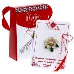 - Broșă Mărțișor Floricică cu Petale Aurii, șnur Marțișor alb-roșu, ambalată în cutie tip gentuță, pregătită cu grijă pentru a fi oferită drept simbol al tradiției și al frumuseții primăverii.