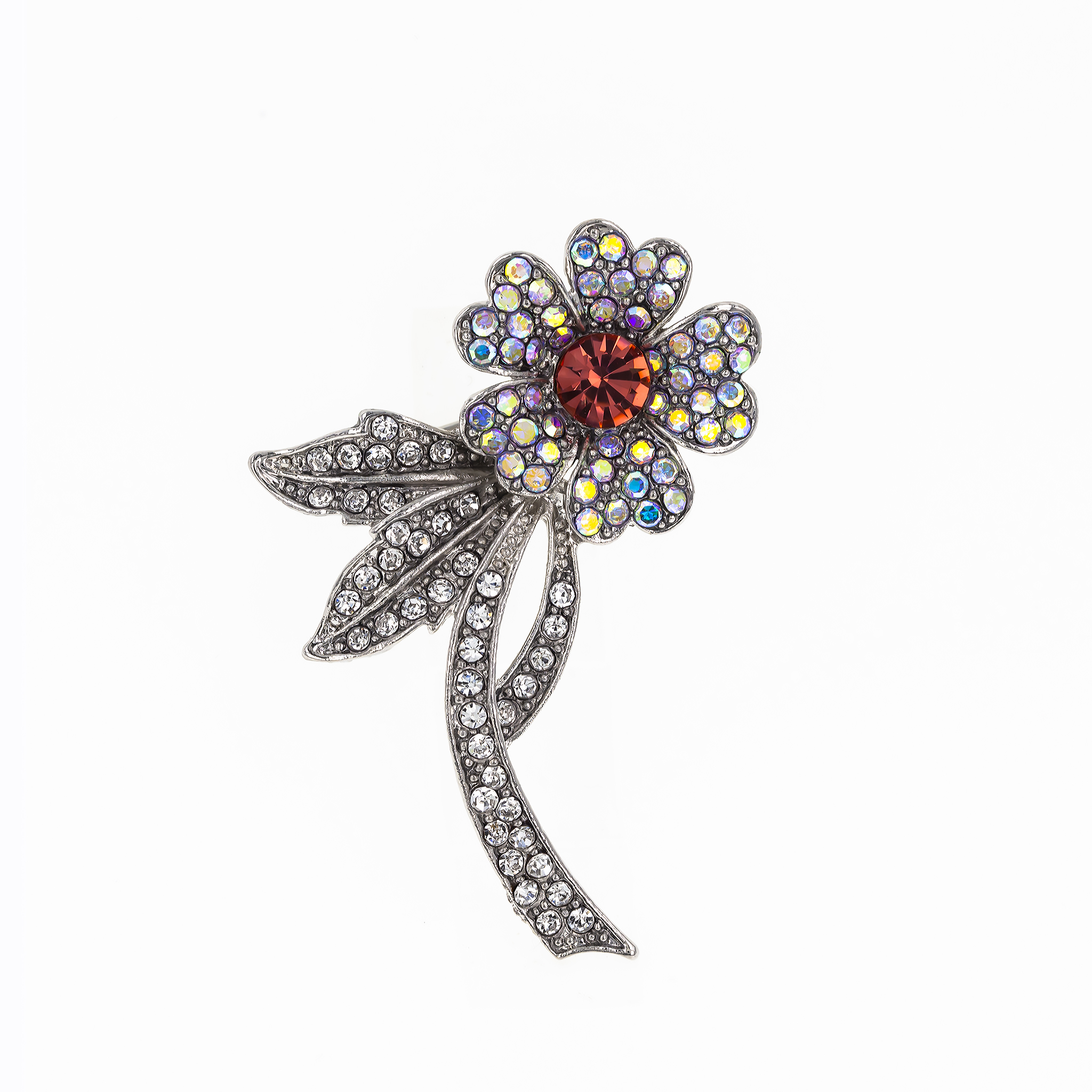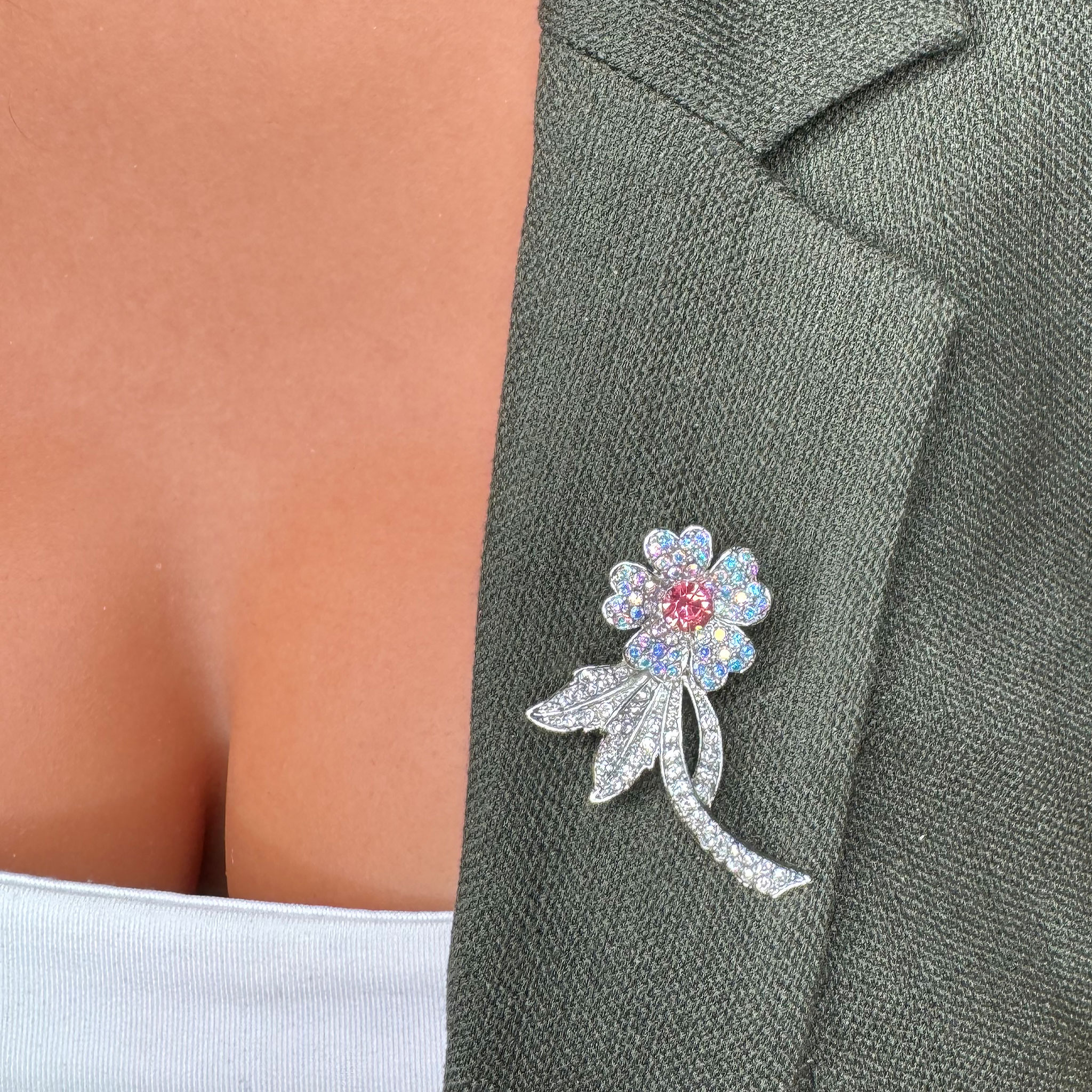 - Design: Broșa este realizată sub forma unei flori stilizate, cu accente strălucitoare care îi conferă un aspect atrăgător. Detaliile fine fac din această bijuterie un accesoriu delicat și elegant.