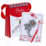- Broșă Mărțișor Gentuță Floricică Strălucitoare, șnur Marțișor alb-roșu, ambalată în cutie tip gentuță, pregătită cu grijă pentru a fi oferită drept simbol al tradiției și al frumuseții primăverii.