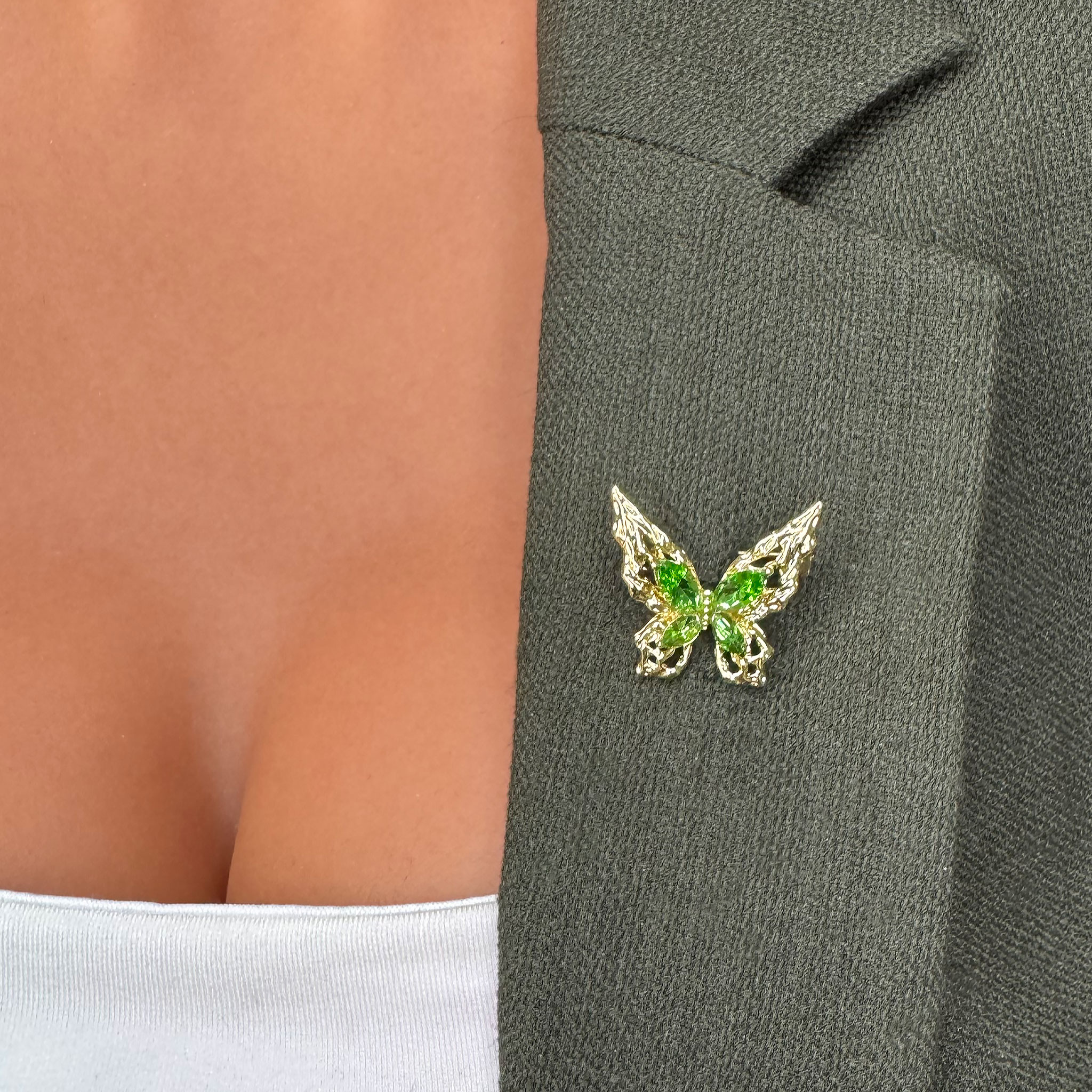 - Fluturașul este un simbol al transformării și al frumuseții efemere. În această bijuterie, fluturașul cu pietre verzi devine o metaforă vie pentru schimbare, evoluție și lumina care însoțește fiecare nou început.