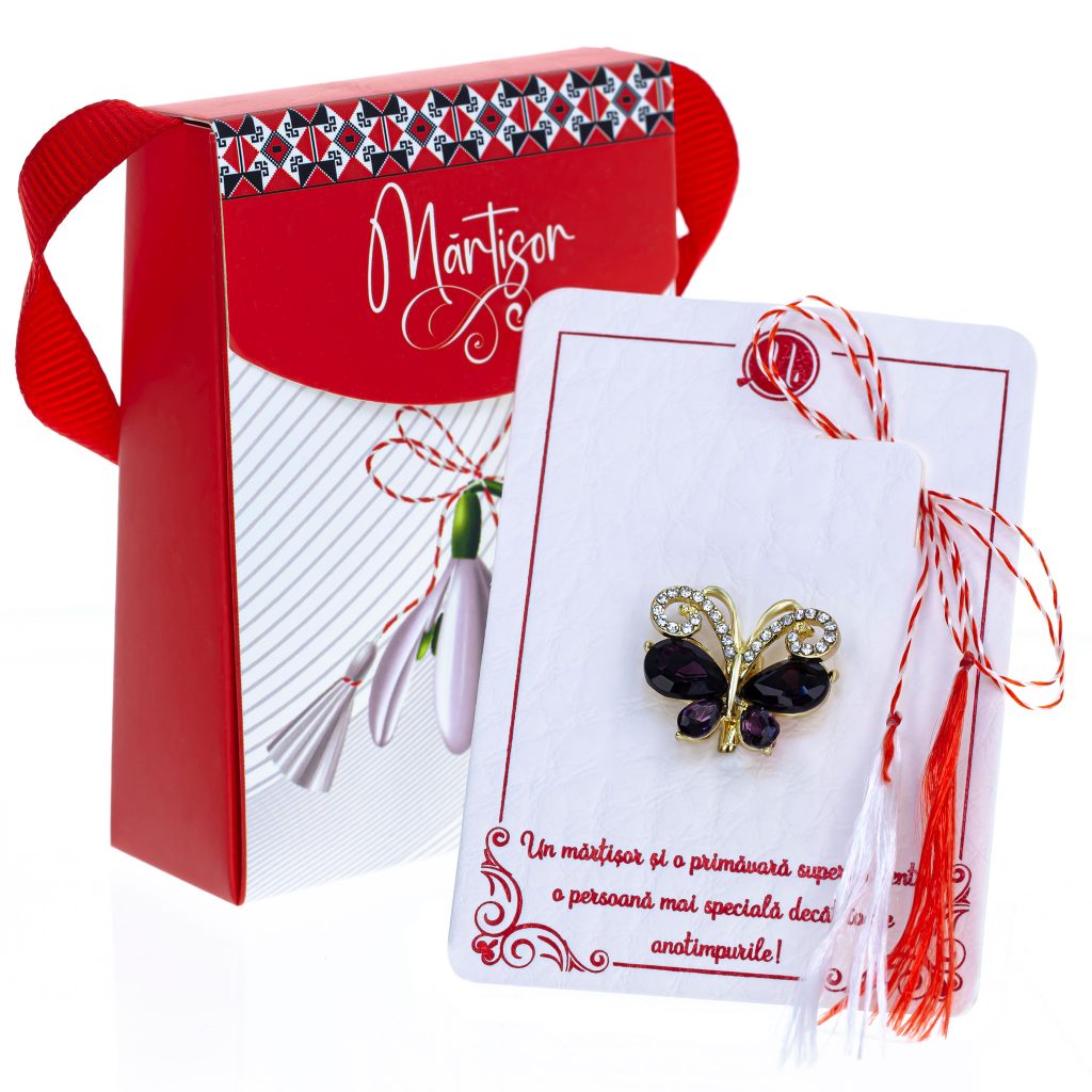 - Broșă Mărțișor Gentuță Fluturaș Auriu cu Pietricele, șnur Marțișor alb-roșu, ambalată în cutie tip gentuță, pregătită cu grijă pentru a fi oferită ca un cadou special, simbol al tradiției.
