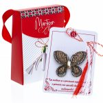 - Broșă Mărțișor Gentuță Fluturaș cu Aripioare Aurii, șnur Marțișor alb-roșu, ambalată în cutie tip gentuță, pregătită cu grijă pentru a fi oferită drept simbol al tradiției și al frumuseții primăverii.