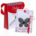 - Broșă Mărțișor Gentuță Fluturaș cu Aripioare Negre, șnur Marțișor alb-roșu, ambalată în cutie tip gentuță, pregătită cu grijă pentru a fi oferită drept simbol al tradiției și al frumuseții primăverii.