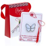 - Broșă Mărțișor Gentuță Fluture Argintiu cu Aripi Albe, șnur Marțișor alb-roșu, ambalată în cutie tip gentuță, pregătită cu grijă pentru a fi oferită ca un cadou special, simbol al tradiției.