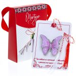 - Broșă Mărțișor Gentuță Fluture Argintiu cu Aripi Roz, șnur Marțișor alb-roșu, ambalată în cutie tip gentuță, pregătită cu grijă pentru a fi oferită ca un cadou special, simbol al tradiției.