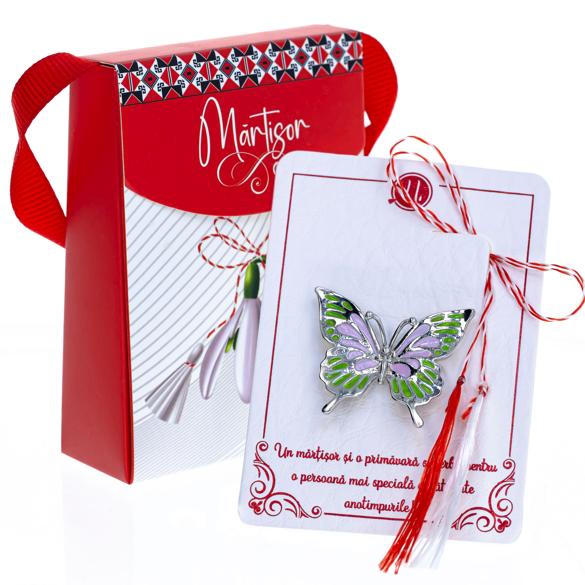 - Broșă Mărțișor Gentuță Fluture Argintiu cu Aripi Verzi, șnur Marțișor alb-roșu, ambalată în cutie tip gentuță, pregătită cu grijă pentru a fi oferită ca un cadou special, simbol al tradiției.