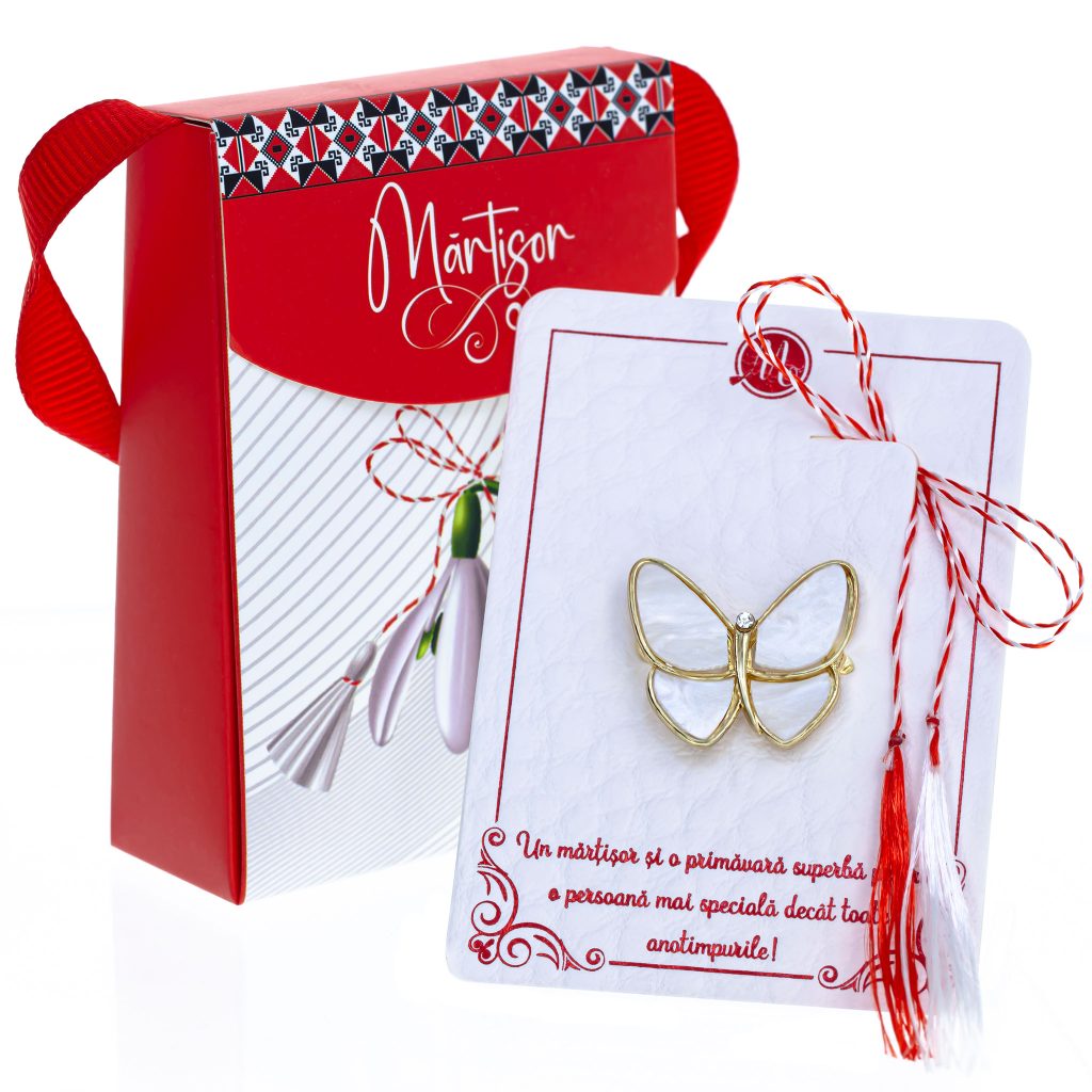 - Broșă Mărțișor Gentuță Fluture Auriu cu Aripi Albe, șnur Marțișor alb-roșu, ambalată în cutie tip gentuță, pregătită cu grijă pentru a fi oferită ca un cadou special, simbol al tradiției.