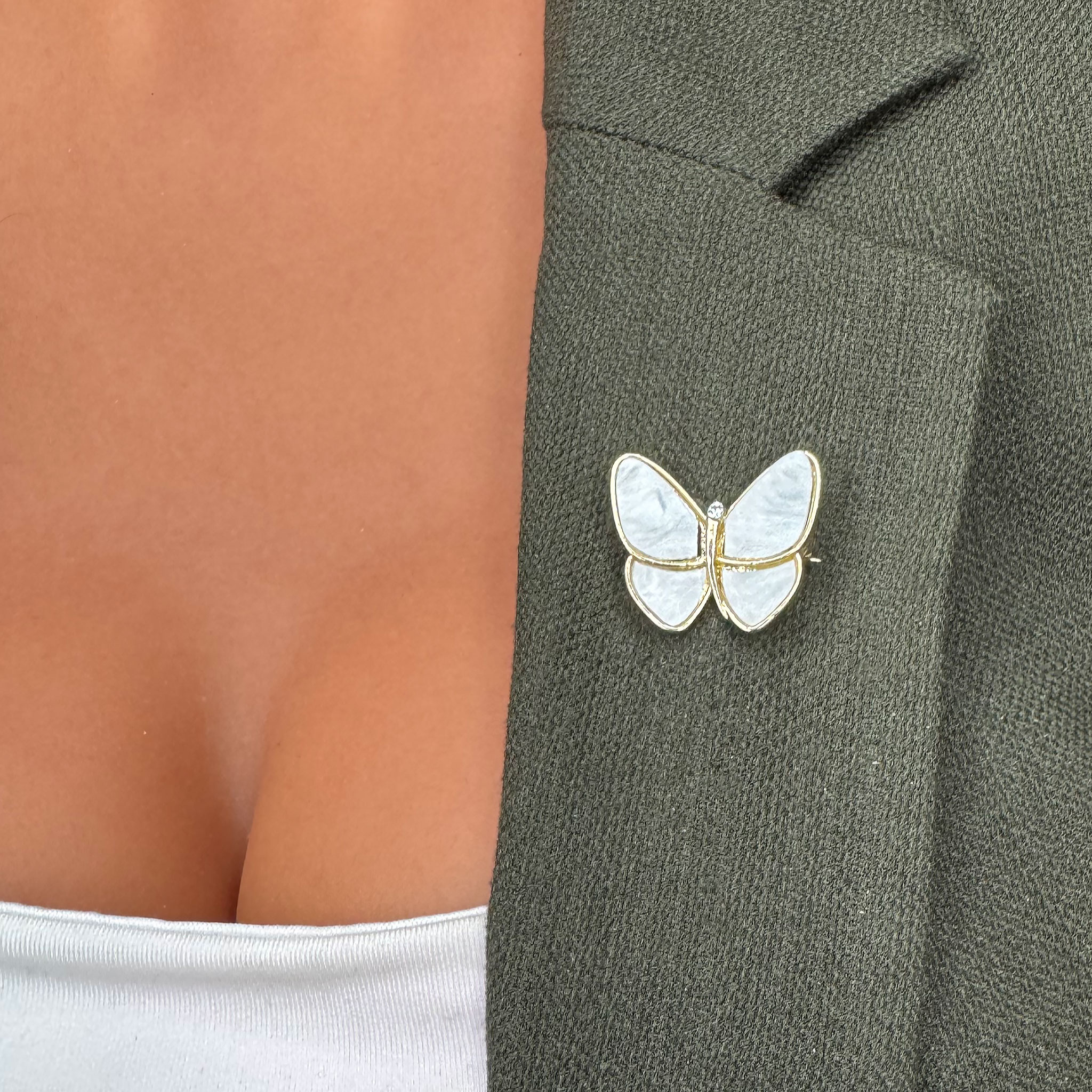 - Design: Fluturele, reprezentat cu detalii fine și aripi deschise, emană fragilitate și grație. Aripile albe, simbolizând puritatea și inocența, adaugă un element de eleganță întregului design. Detaliile subtile ale broșei, precum contururile aripilor și corpul delicat, contribuie la crearea unei bijuterii subtile și rafinate.