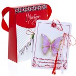 - Broșă Mărțișor Gentuță Fluture Auriu cu Aripi Roz, șnur Marțișor alb-roșu, ambalată în cutie tip gentuță, pregătită cu grijă pentru a fi oferită ca un cadou special, simbol al tradiției.