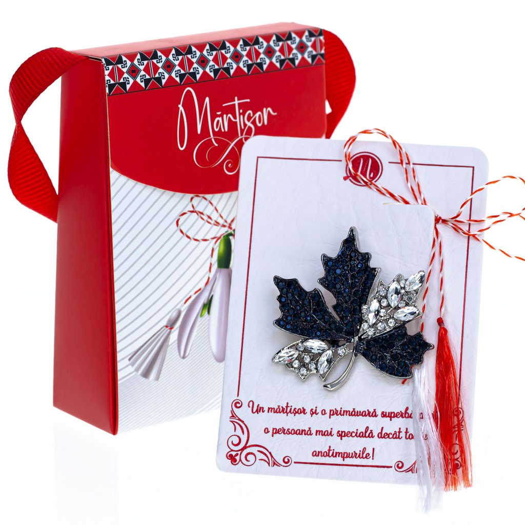 - Broșă Mărțișor Gentuță Frunză Argintie cu Pietre Negre, șnur Marțișor alb-roșu, ambalată în cutie tip gentuță, pregătită cu grijă pentru a fi oferită ca un cadou special, simbol al tradiției.