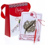 - Broșă Mărțișor Gentuță Frunză Aurie cu Pietricele, șnur Marțișor alb-roșu, ambalată în cutie tip gentuță, pregătită cu grijă pentru a fi oferită drept simbol al tradiției și al frumuseții primăverii.