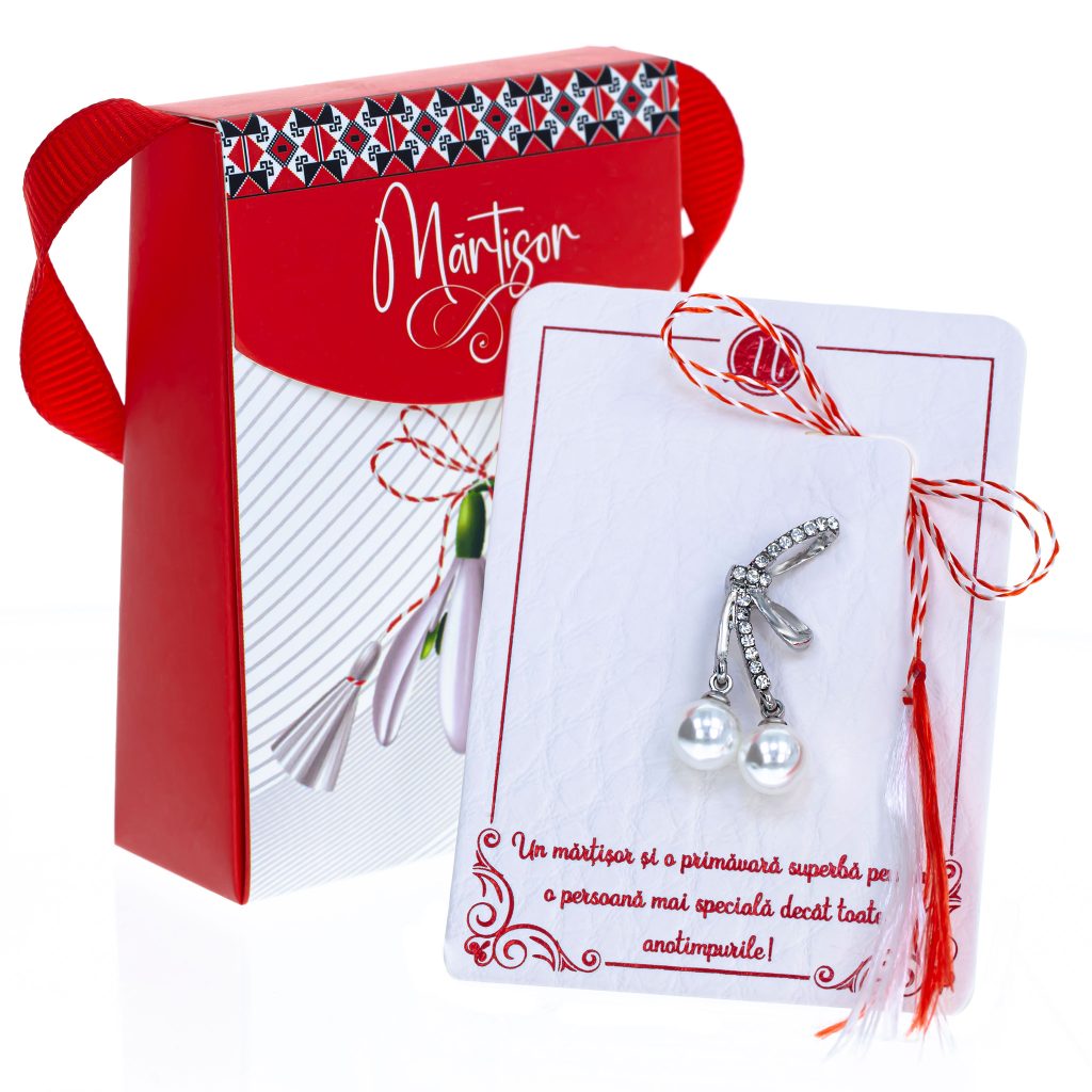 - Broșă Mărțișor Gentuță Fundă Argintie cu Perle, șnur Marțișor alb-roșu, ambalată în cutie tip gentuță, pregătită cu grijă pentru a fi oferită ca un cadou special, simbol al tradiției.