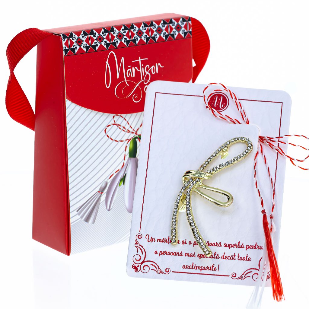 - Broșă Mărțișor Gentuță Fundă Aurie Stilizată, șnur Marțișor alb-roșu, ambalată în cutie tip gentuță, pregătită cu grijă pentru a fi oferită ca un cadou special, simbol al tradiției.