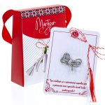 - Broșă Mărțișor Gentuță Fundă Stilizată Argintie, șnur Marțișor alb-roșu, ambalată în cutie tip gentuță, pregătită cu grijă pentru a fi oferită ca un cadou special, simbol al tradiției.