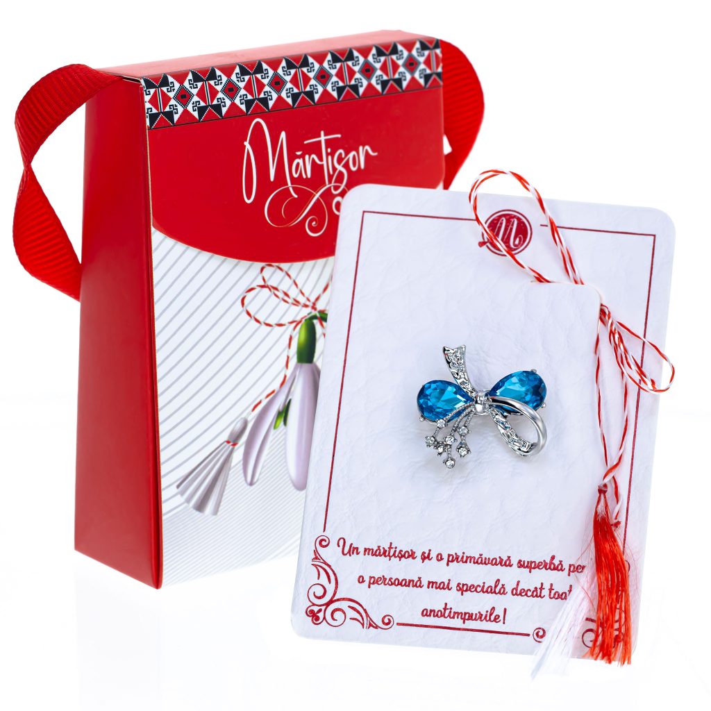 - Broșă Mărțișor Gentuță Fundiță Argintie cu Pietre Albastre, șnur Marțișor alb-roșu, ambalată în cutie tip gentuță, pregătită cu grijă pentru a fi oferită ca un cadou special, simbol al tradiției.