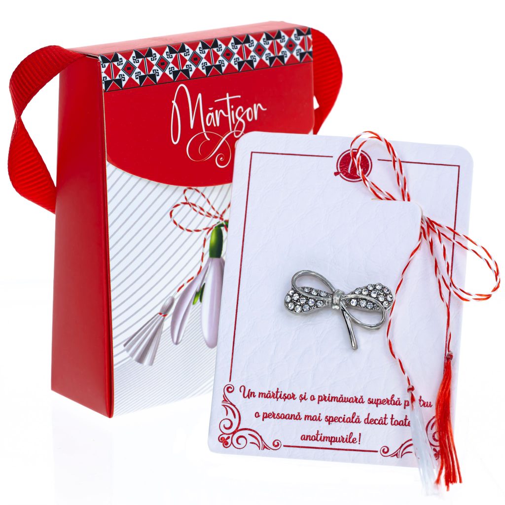 - Broșă Mărțișor Gentuță Fundiță Argintie cu Pietricele, șnur Marțișor alb-roșu, ambalată în cutie tip gentuță, pregătită cu grijă pentru a fi oferită ca un cadou special, simbol al tradiției.