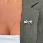 - Design: Broșa în formă de fundiță emană o eleganță subtilă și o delicatețe care imediat atrage atenția. Forma fundiței, îmbogățită cu pietricele strălucitoare, adaugă un element de strălucire și glamour, făcând din această bijuterie o alegere perfectă pentru orice ocazie festivă.
