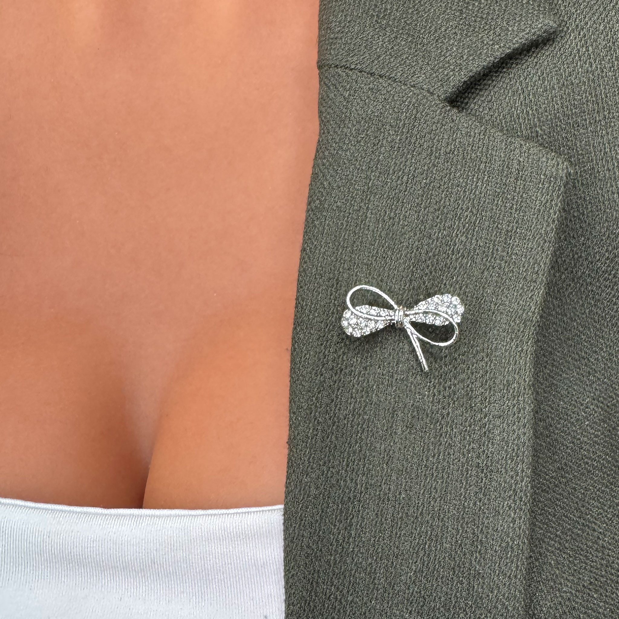 Această broșă emană o aură de rafinament și eleganță, potrivită pentru a evidenția frumusețea și feminitatea într-un mod subtil și rafinat. Cu designul său în formă de fundă și strălucirea pietrelor, transmite un aer sofisticat și clasic, fiind potrivită pentru ocazii speciale sau pentru a sublinia eleganța unei ținute.
