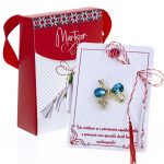 - Broșă Mărțișor Gentuță Fundiță Aurie cu Pietre Albastre, șnur Marțișor alb-roșu, ambalată în cutie tip gentuță, pregătită cu grijă pentru a fi oferită ca un cadou special, simbol al tradiției.