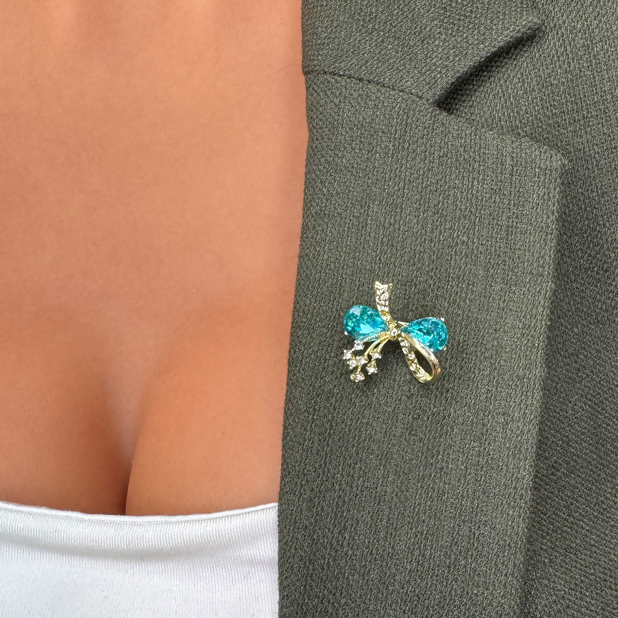 Această broșă emană o aură de rafinament și eleganță, potrivită pentru a evidenția frumusețea și feminitatea într-un mod subtil și rafinat. Cu designul său în formă de fundă și strălucirea pietrelor, transmite un aer sofisticat și clasic, fiind potrivită pentru ocazii speciale sau pentru a sublinia eleganța unei ținute.