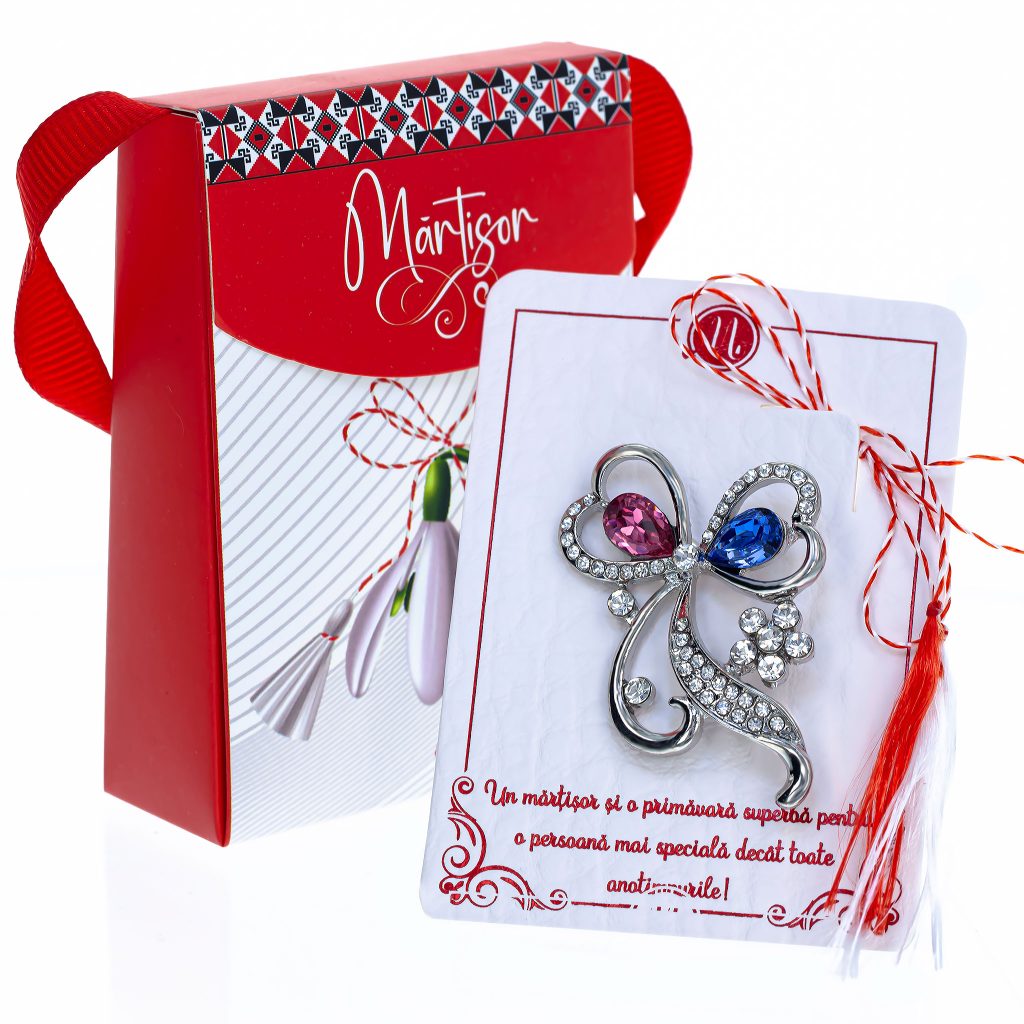 - Broșă Mărțișor Gentuță Fundiță cu Pietre Multicolore, șnur Marțișor alb-roșu, ambalată în cutie tip gentuță, pregătită cu grijă pentru a fi oferită ca un cadou special, simbol al tradiției.