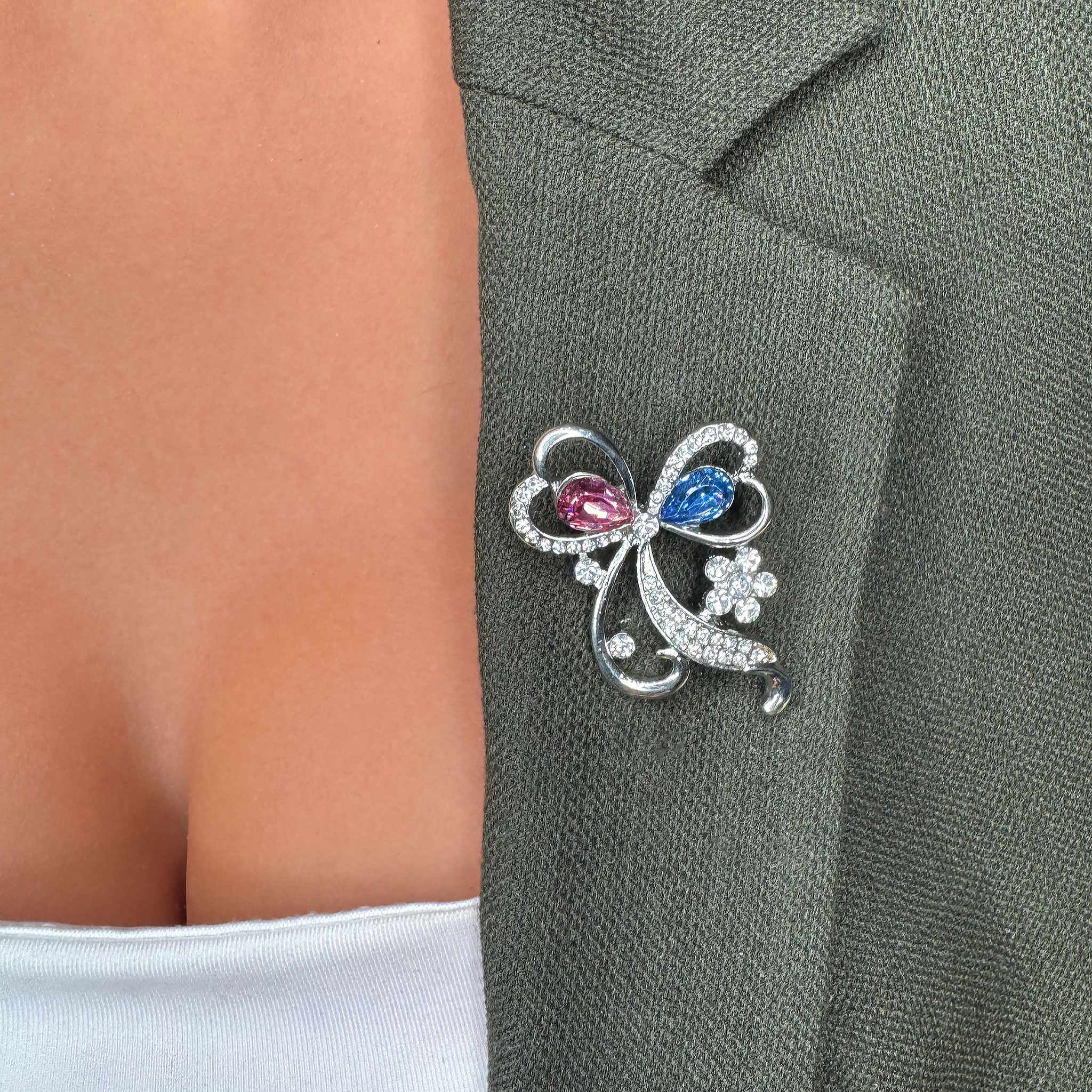 - Design: Fundița, simbolul clasic al feminității și al eleganței, este reinterpretată într-un mod modern și vibrant. Pietrele multicolore, plasate cu grijă pe suprafața fundiței, aduc un element de strălucire și culoare distinctiv. Detaliile atent lucrate ale broșei contribuie la crearea unei bijuterii fermecătoare și pline de viață.