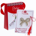- Broșă Mărțișor Gentuță Fundiță Dublă, șnur Marțișor alb-roșu, ambalată în cutie tip gentuță, pregătită cu grijă pentru a fi oferită drept simbol al tradiției și al frumuseții primăverii.