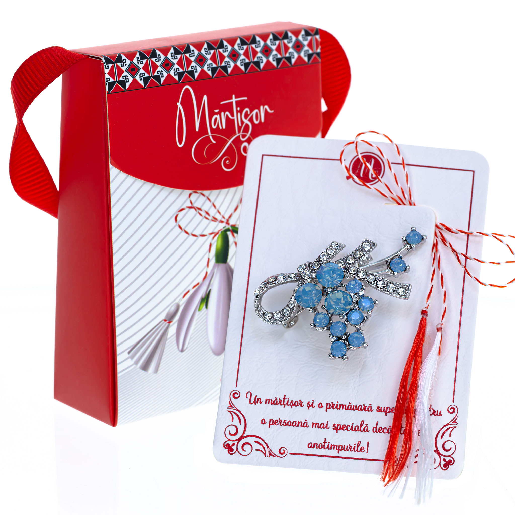 - Broșă Mărțișor Gentuță Fundiță Stilizată cu Pietre Albastre, șnur Marțișor alb-roșu, ambalată în cutie tip gentuță, pregătită cu grijă pentru a fi oferită drept simbol al tradiției și al frumuseții primăverii.