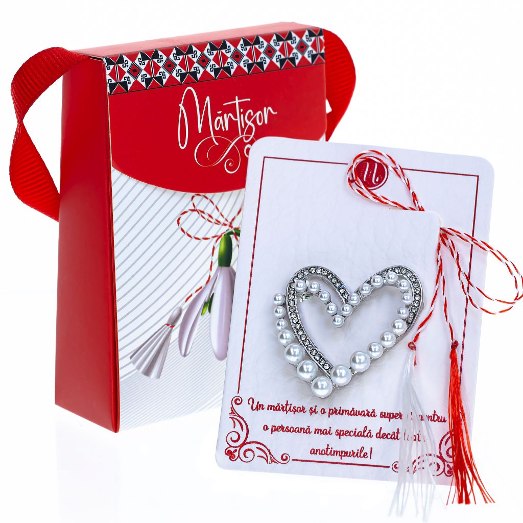- Broșă Mărțișor Gentuță Inimioară Argintie cu Perluțe, șnur Marțișor alb-roșu, ambalată în cutie tip gentuță, pregătită cu grijă pentru a fi oferită ca un cadou special, simbol al tradiției.