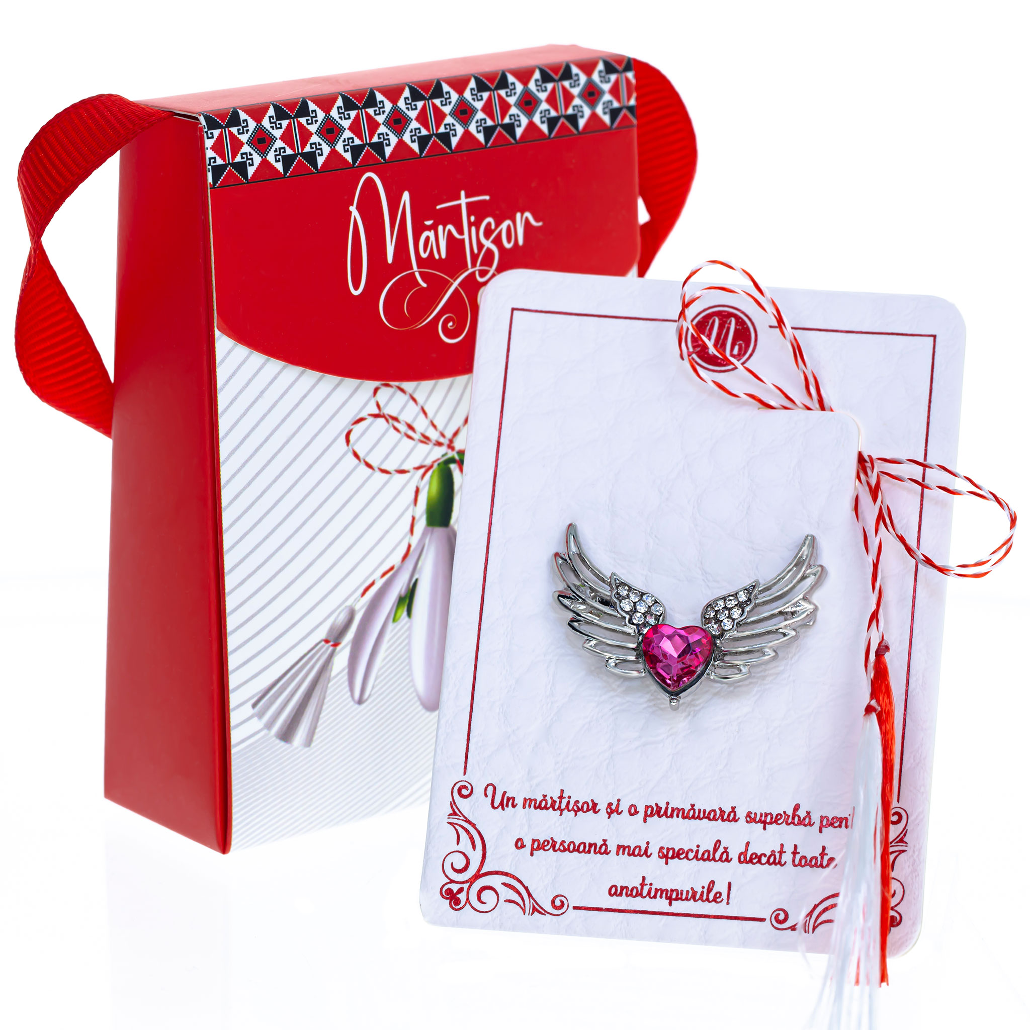 - Broșă Mărțișor Gentuță Inimioara cu Aripi Argintii, șnur Marțișor alb-roșu, ambalată în cutie tip gentuță, pregătită cu grijă pentru a fi oferită ca un cadou special, simbol al tradiției.