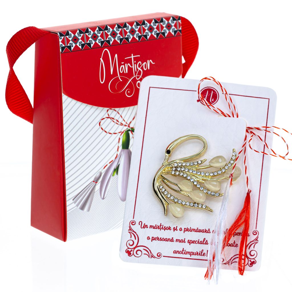 - Broșă Mărțișor Gentuță Lebădă Aurie, șnur Marțișor alb-roșu, ambalată în cutie tip gentuță, pregătită cu grijă pentru a fi oferită ca un cadou special, simbol al tradiției.