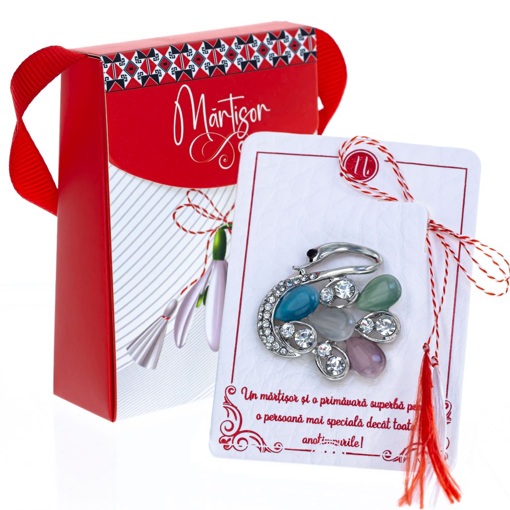 - Broșă Mărțișor Gentuță Lebădă, șnur Marțișor alb-roșu, ambalată în cutie tip gentuță, pregătită cu grijă pentru a fi oferită ca un cadou special, simbol al tradiției.