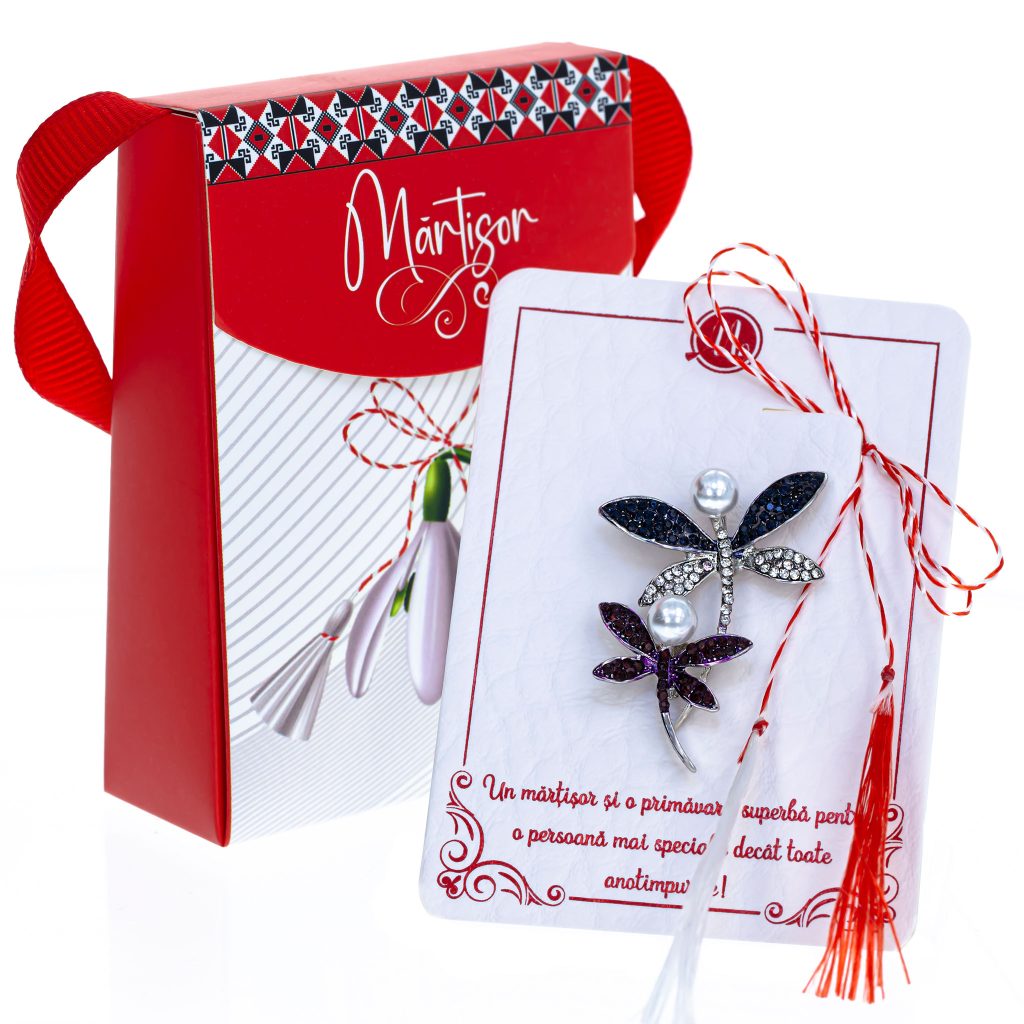 - Broșă Mărțișor Gentuță Libelule Argintii, șnur Marțișor alb-roșu, ambalată în cutie tip gentuță, pregătită cu grijă pentru a fi oferită ca un cadou special, simbol al tradiției.