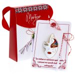 - Broșă Mărțișor Gentuță Mască Venețiană Aurie, șnur Marțișor alb-roșu, ambalată în cutie tip gentuță, pregătită cu grijă pentru a fi oferită drept simbol al tradiției și al frumuseții primăverii.