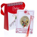 - Broșă Mărțișor Gentuță Pălărie Aurie cu Floricele, șnur Marțișor alb-roșu, ambalată în cutie tip gentuță, pregătită cu grijă pentru a fi oferită drept simbol al tradiției și al frumuseții primăverii.